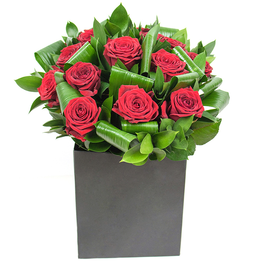 Enhance your décor with our beautiful red rose arrangement, featuring vibrant red roses paired with lush aspidistra leaves and soft ruscus. This unique design exudes elegance and charm.