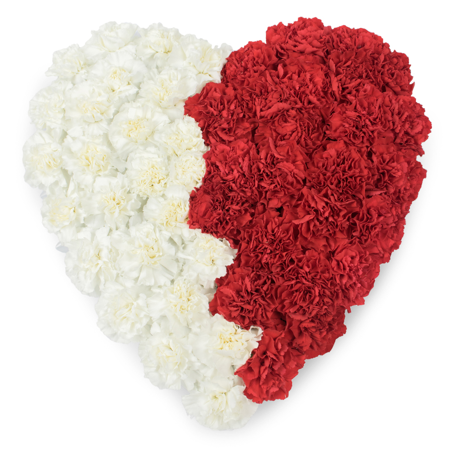 Embrace elegance with our heart-shaped carnation arrangement, featuring pure white and bold red carnations. Each bloom is hand-selected to ensure maximum freshness and beauty.